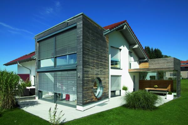 Raffstorenlamellen wirken herabgefahren sehr filigran und verleihen der Fassade eine pure und flache Optik.